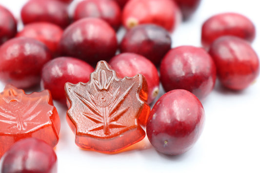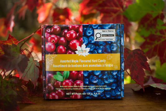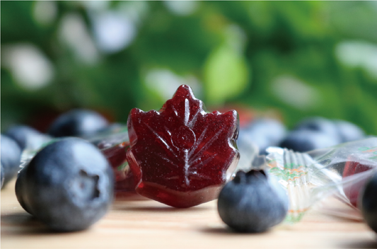 Maple leaf shaped and wrapped individually. Made with Canada Grade A Amber maple syrup, pure berry juices.