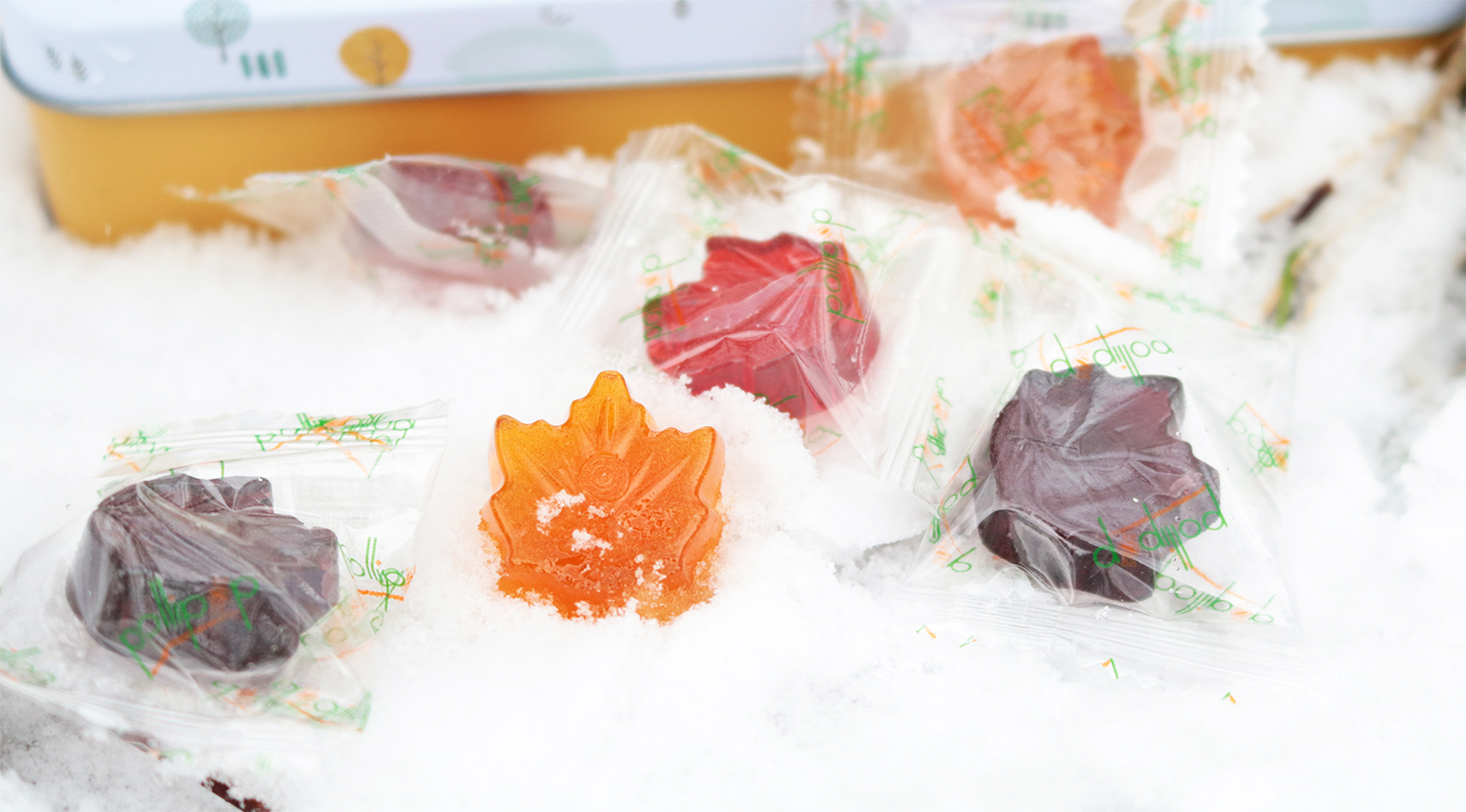 Maple Leaf and Moose Head shaped. Made with Canada Grade A Amber maple syrup, pure berry juices. Packaged with food grade environmentally friendly materials.