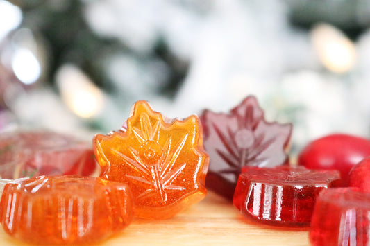 Maple leaf shaped and wrapped individually. Made with Canada Grade A Amber maple syrup, pure berry juices.